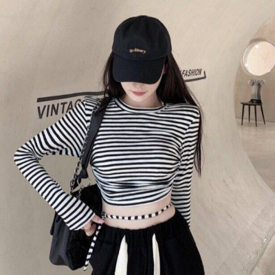 100KG胖女可穿2022新款韩式条纹长袖T恤女式短袖加大码盖腹圆领时尚T恤连衣裙优雅衬衫女式T恤